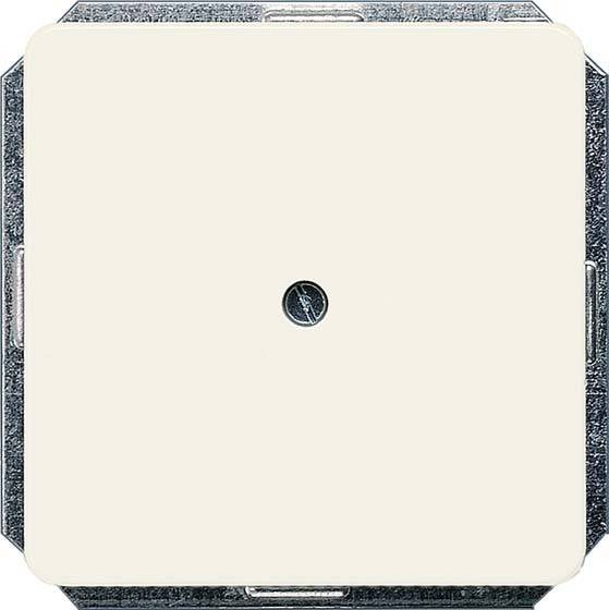 Lichtschalter im ausgeschalteten Zustand, quadratische Form, weiße Oberfläche, silberner Rand, zentrales Schraubloch.